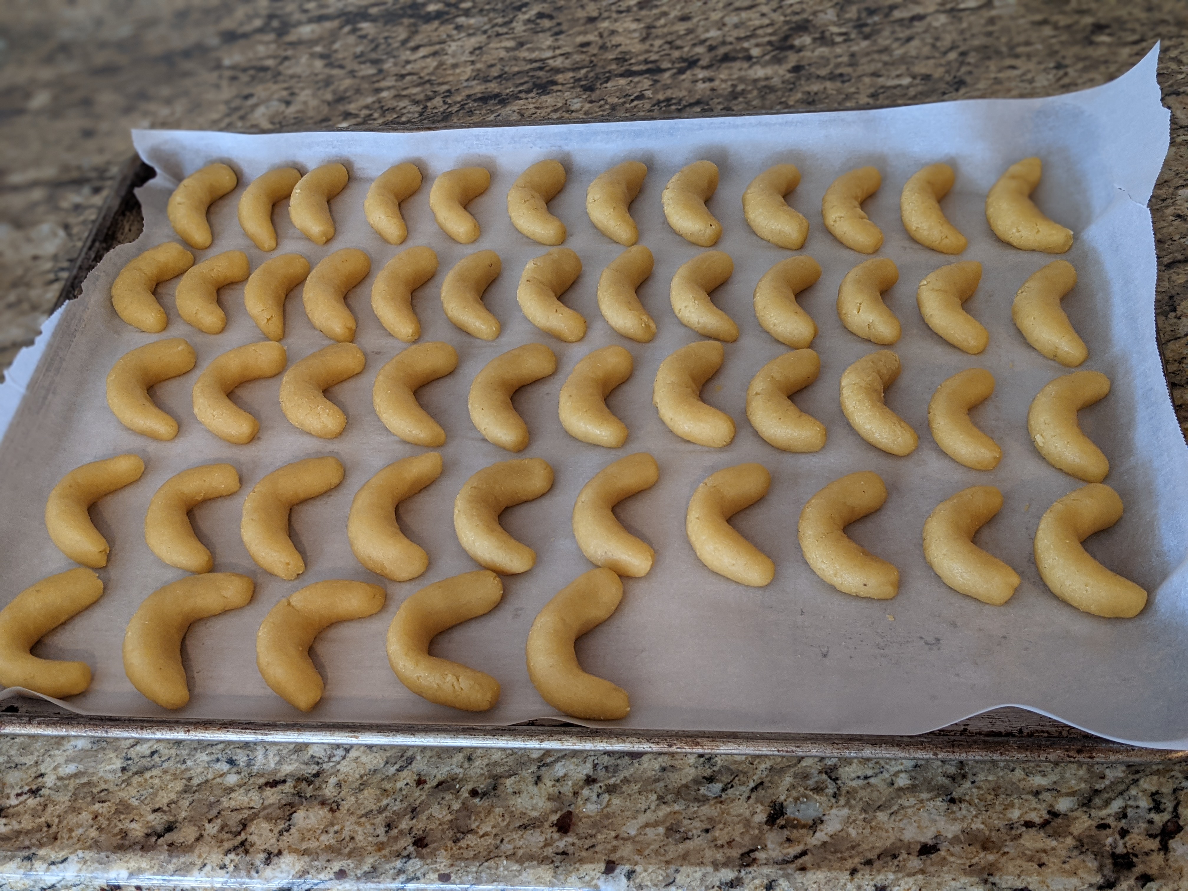 - Form dough into half moons on baking tray