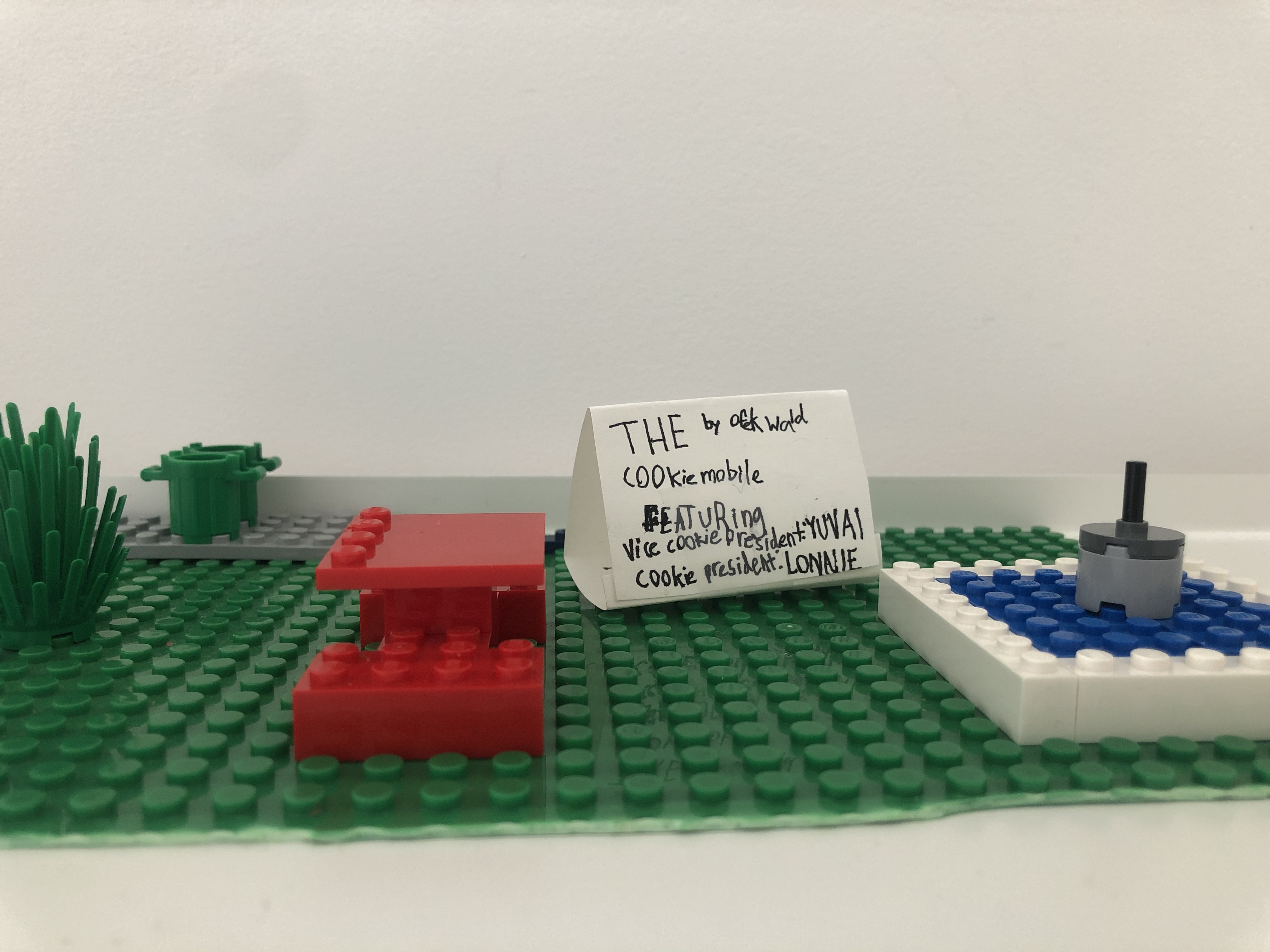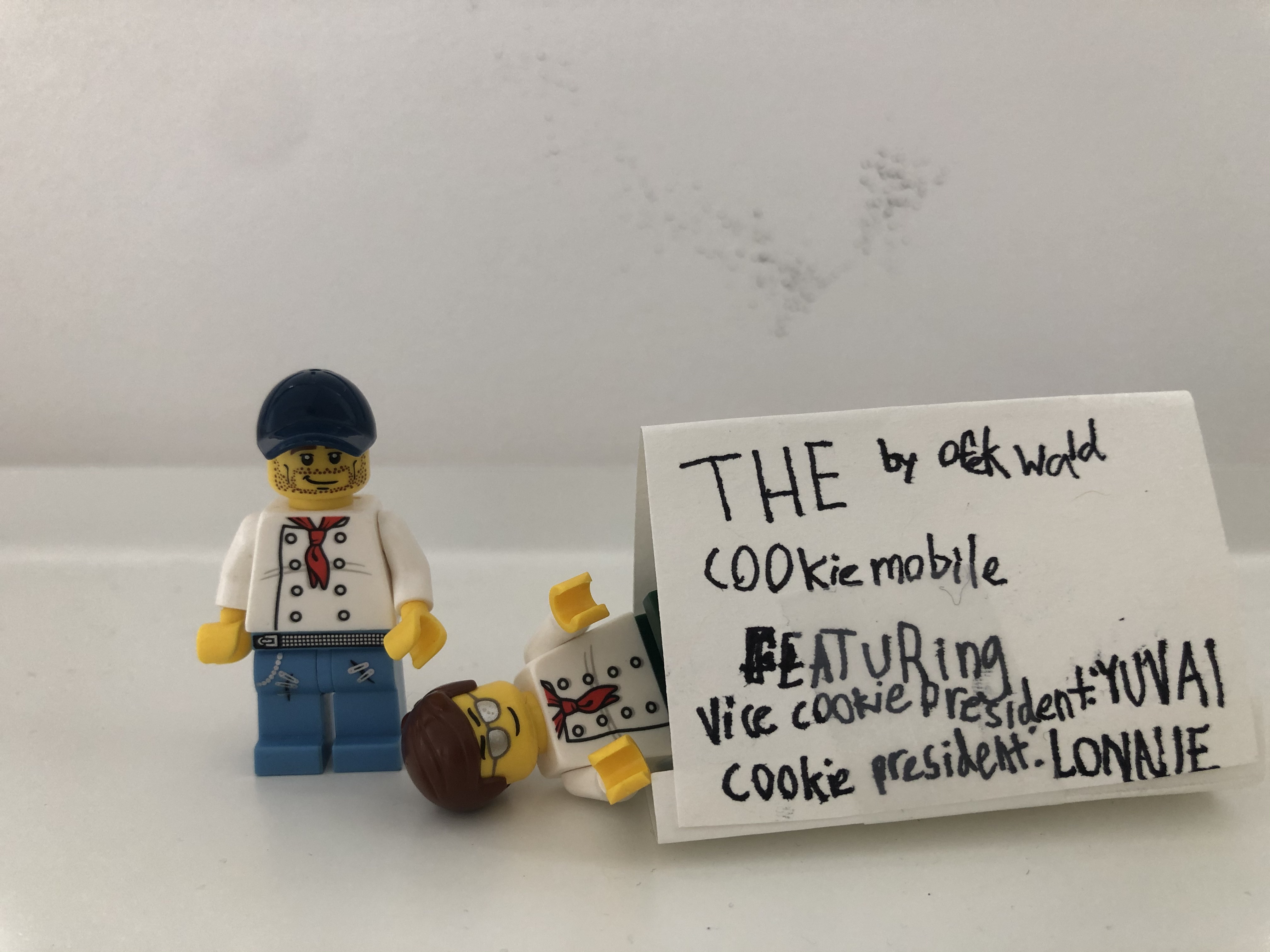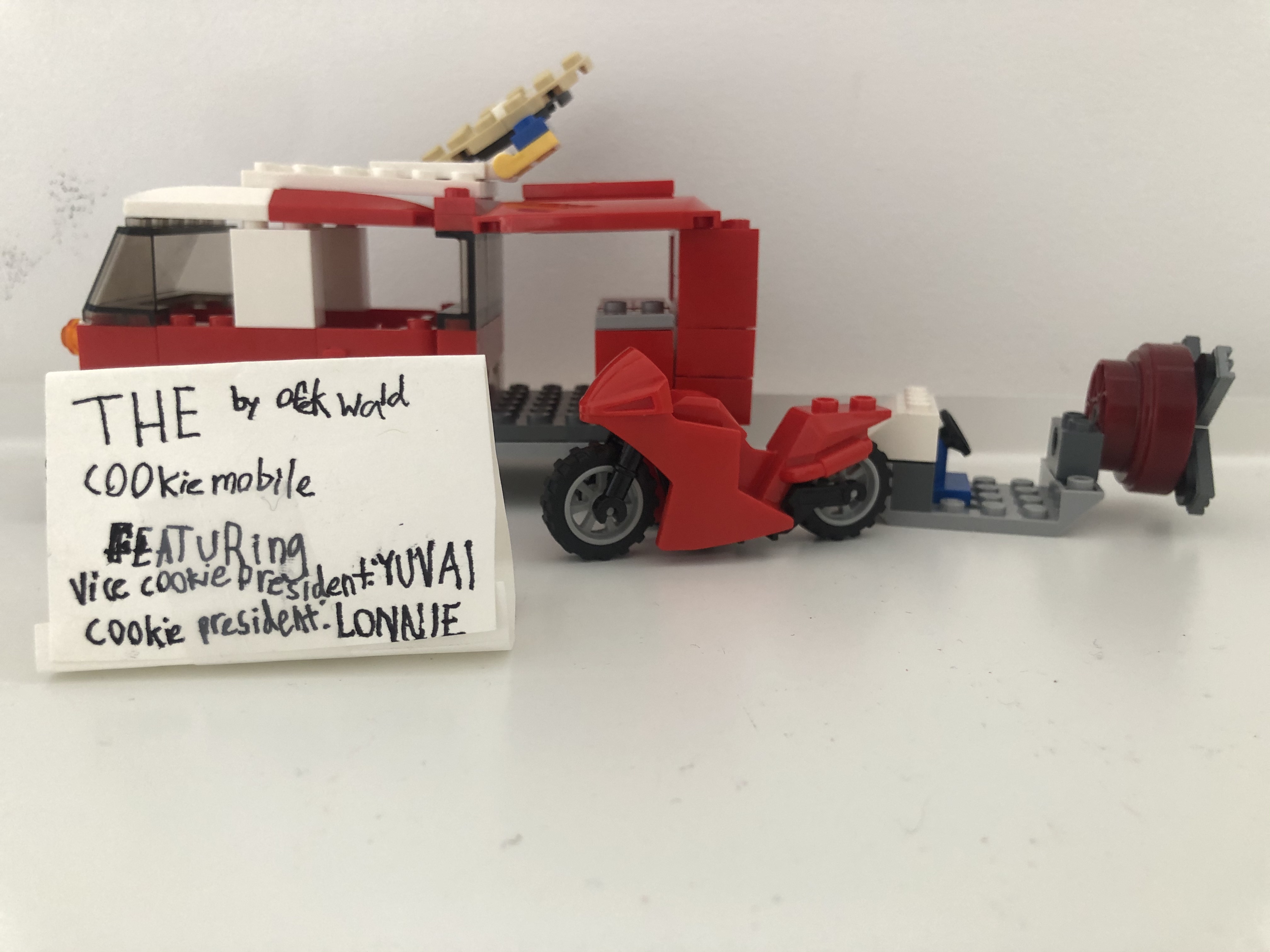 “I featured Yuval & Lonnie mini figures I also featured a park scene featuring a random hovercraft (you COULD use it for ingredient deliveries ) a picnic table, two garbage cans, a bush, a fountain,and a motorcycle someone left parked in the park. The cookie mobile features a driver’s cabin, a passenger cabin, a kitchen ideal with open-air sides, a refrigerator, an oven & stove with controls, a workspace, and removable ceilings. Also there is a brick-built cookie on the top. It took me three days to build. I hope you like the photos I took of it. I also hope that the cookie Party will be successful this year” -Ofek